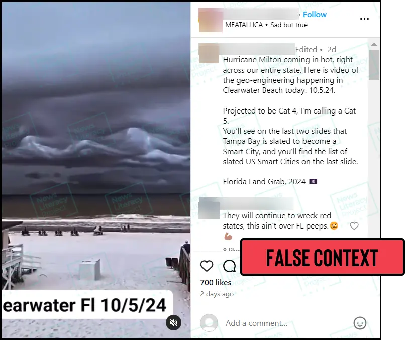 The article tells us that the picture, which is a still photo of a video (seen below), wasn’t even filmed during Hurricane Milton. In actuality, it was filmed in 2021—three years before the hurricane occurred. It also didn’t depict a hurricane but instead showed asperitas cloud formations—which are rare but entirely natural.